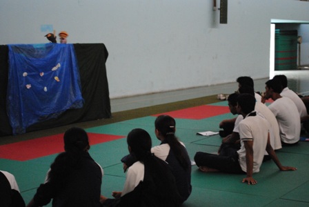 まず、人形劇やコントをみせて、アイスブレイクをし