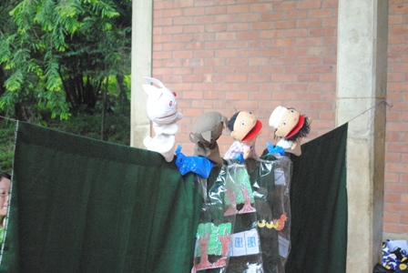 カチカチ山、みんな一緒に、大きなカブの3つのお話を人形劇で行いました。